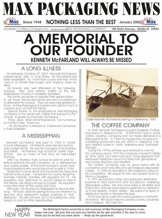 In 1948, Kenneth McFarland founded Gadsden Coffee Company, Inc. as a food service distributor. After years of experience, in 1980, Mr. McFarland with his three sons, saw a greater need for a quality custom packaging company. This idea has led to Max Packaging Company today.